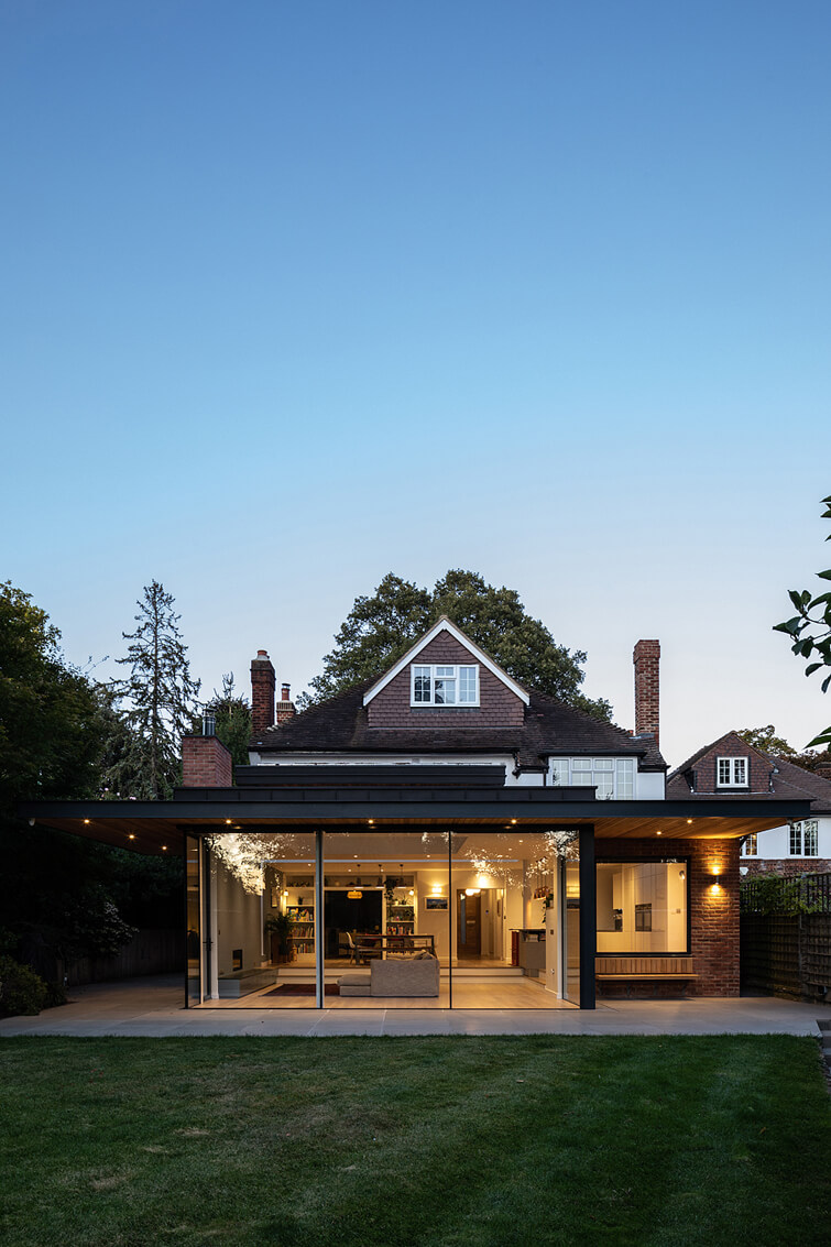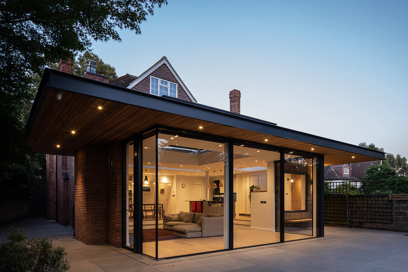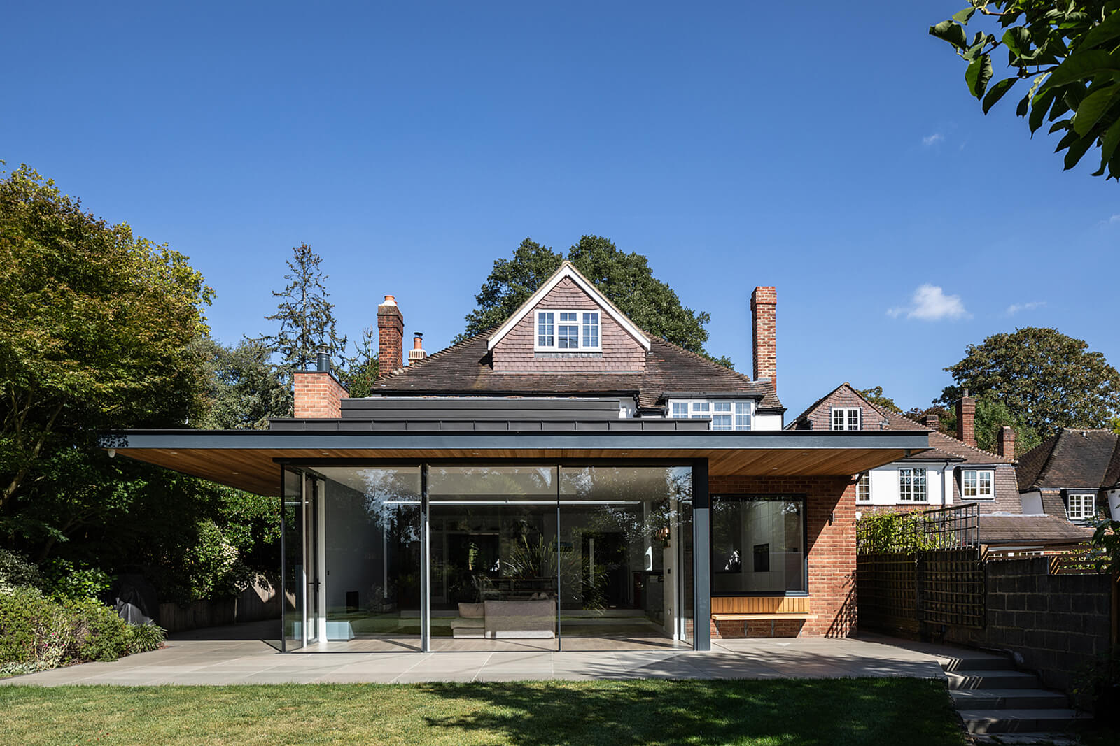 Located within the Blackheath Park Conservation Area, the rear extension is defined by cantilevered roof planes that appear to float above a glazed façade, creating a sense of lightness and tension. These planes extend beyond the envelope to provide shelter and opportunities for outdoor occupation, while blurring the threshold between interior and exterior.