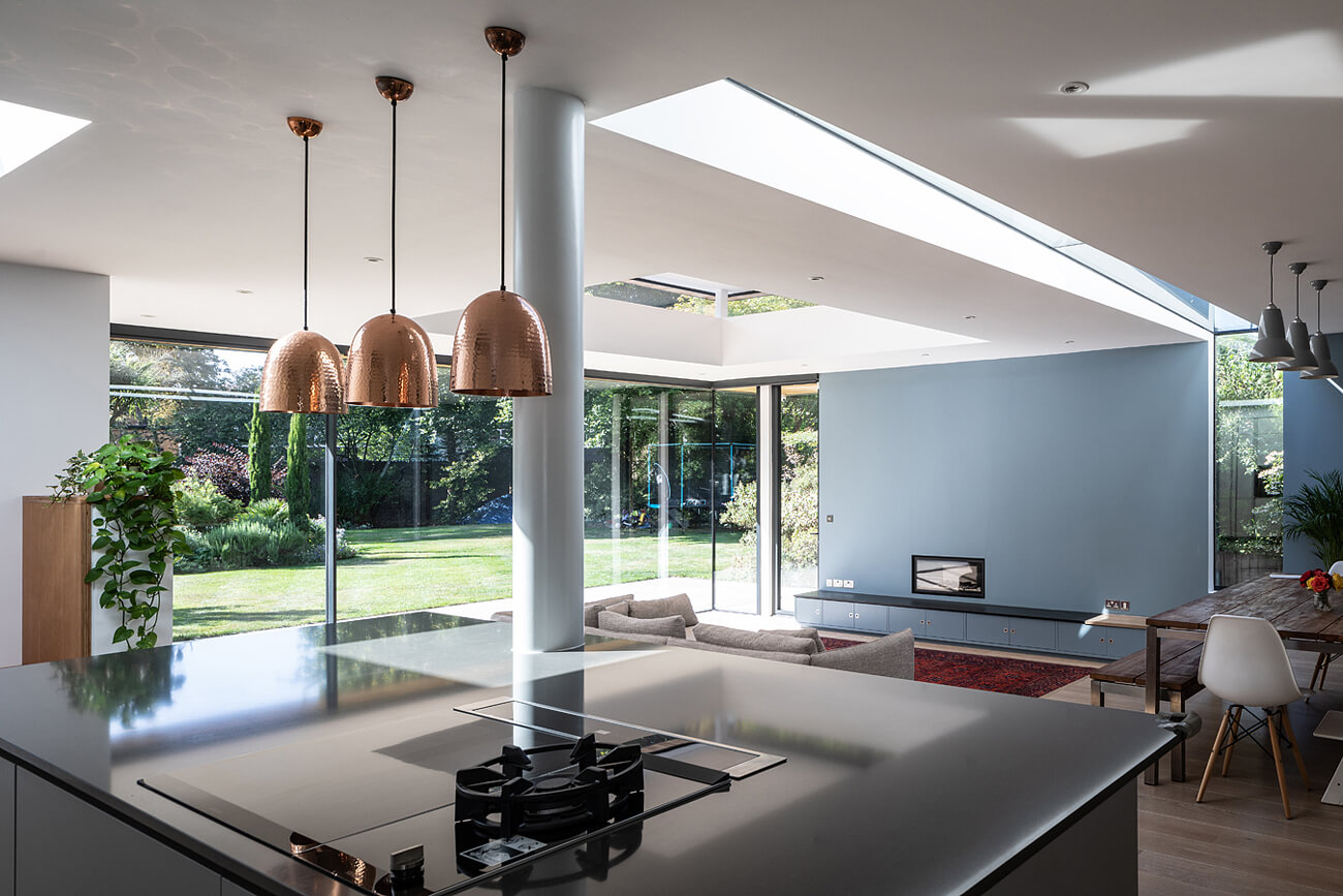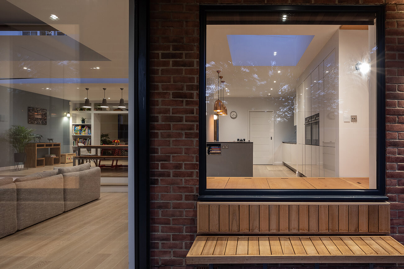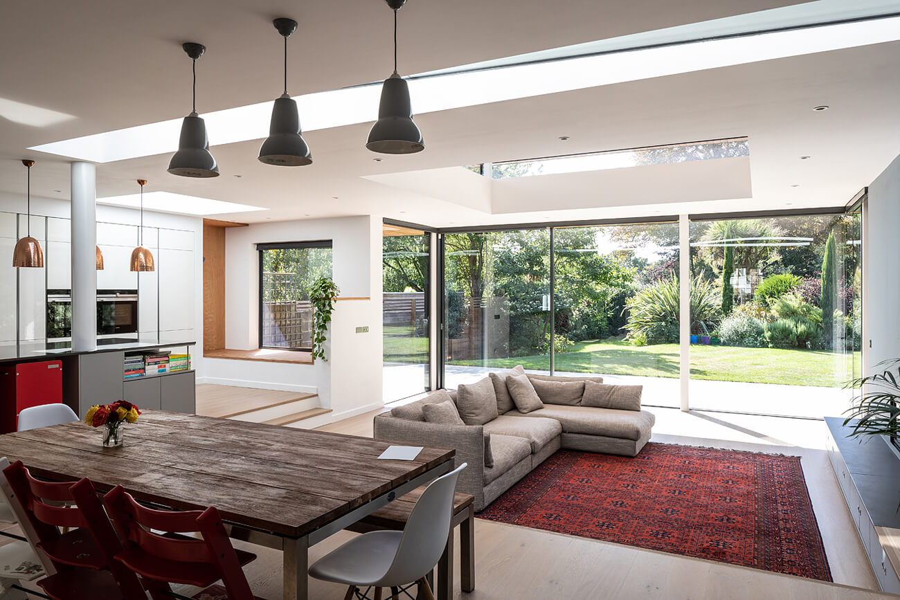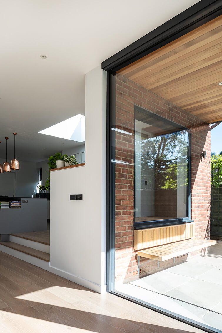 Within the open-plan arrangement, carefully considered level changes and glazing subtly define zones for living, dining and cooking. A structurally glazed link introduces daylight deep into the plan, while an elevated glazed lantern defines the informal living space below, enhancing both spatial clarity and liveability.
